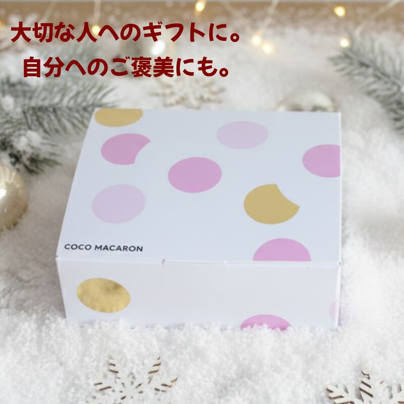 【原材料】 グラニュー糖、アーモンドパウダー、粉糖、卵白、チョコレート、植物性クリーム、キャラメル、フリーズドライフランボワーズ、ココアパウダー、食紅(原材料の一部に卵・乳成分を含む)