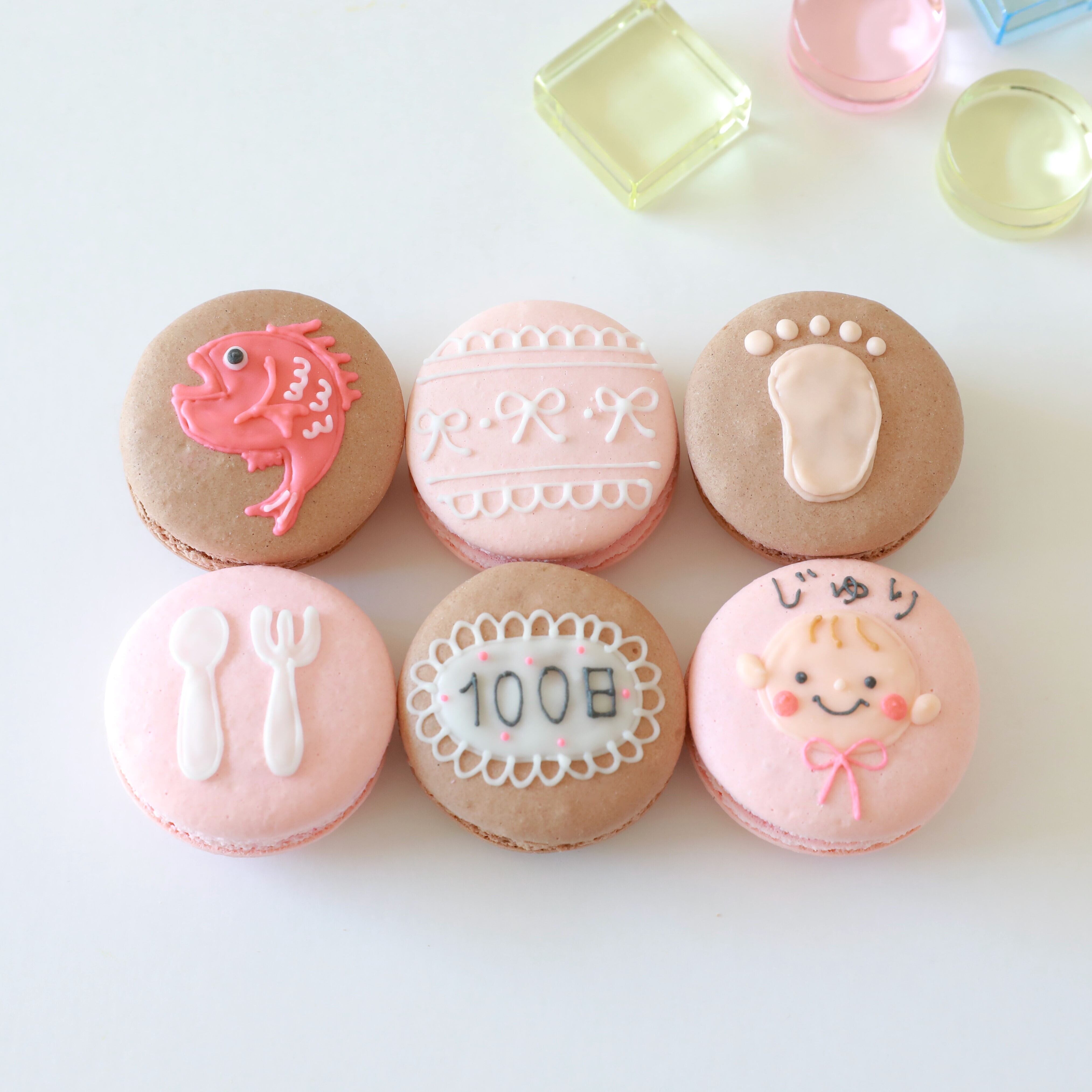赤ちゃんの百日祝いやお返しにピッタリの可愛いイラスト入りマカロンセットです(ラッピング代込み)