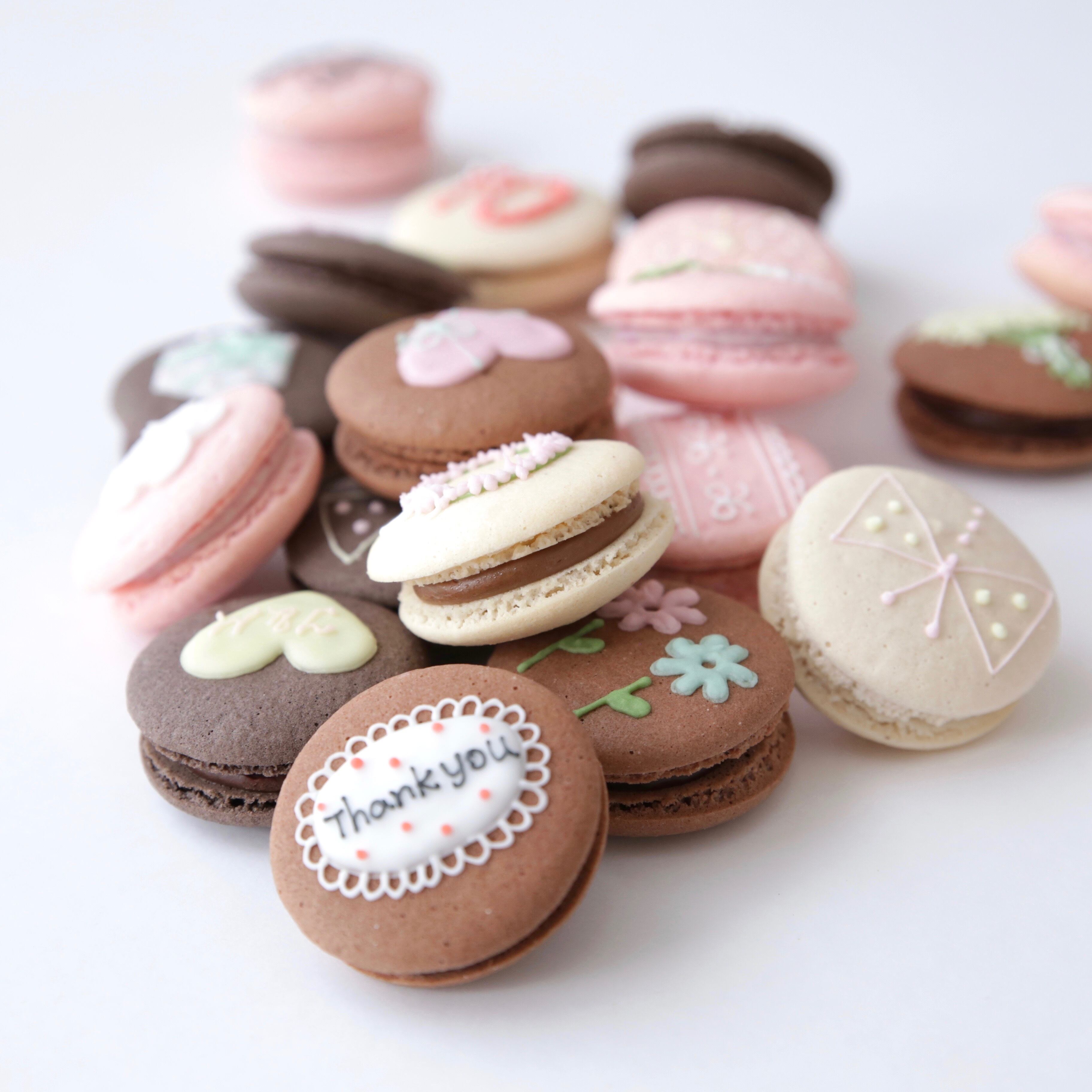 素材のこだわったマカロン生地に、お客様ご要望のイラストを一つ一つ手書きで描いています。